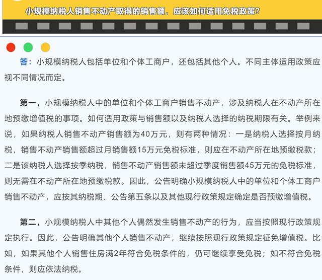 6、小規(guī)模納稅人中的單位和個體工商戶銷售不動產(chǎn),應按其納稅期、本公告第五條以及其他現(xiàn)行政策規(guī)定確定是否預繳增值稅;其他個人銷售不動產(chǎn),繼續(xù)按照現(xiàn)行規(guī)定征免增值稅。