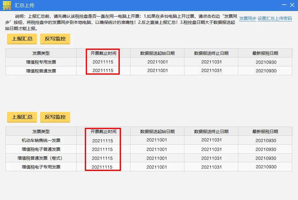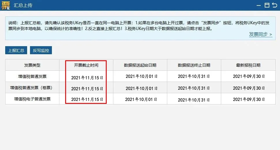 操作流程:重新打開匯總上傳界面,查看各發(fā)票類型開票截止時(shí)間是否更新到下月中旬,若更新,說明操作成功。